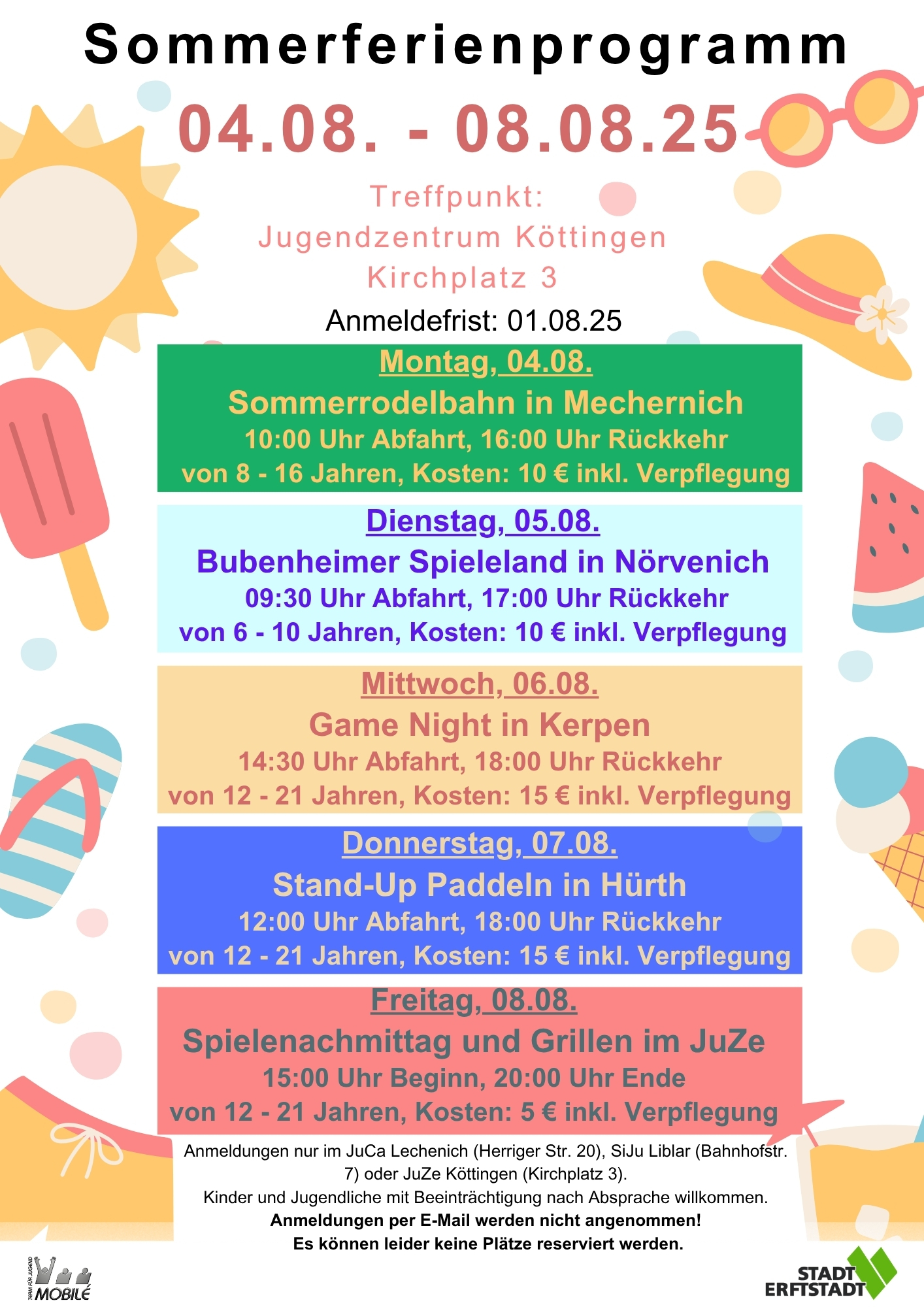 Anmeldebögen können im Jugendzentrum Köttingen (Kirchplatz 3), im Jugendtreff SiJu in Liblar (Bahnhofstr. 7) oder im Jugendcafé in Lechenich (Herriger Str. 20) ausgefüllt werden oder sind online zu finden unter www.jugendberatung-mobile.de. Die Anmeldungen müssen bis zum 01.08. in einer der Einrichtungen mit dem Teilnahmebeitrag abgegeben werden.