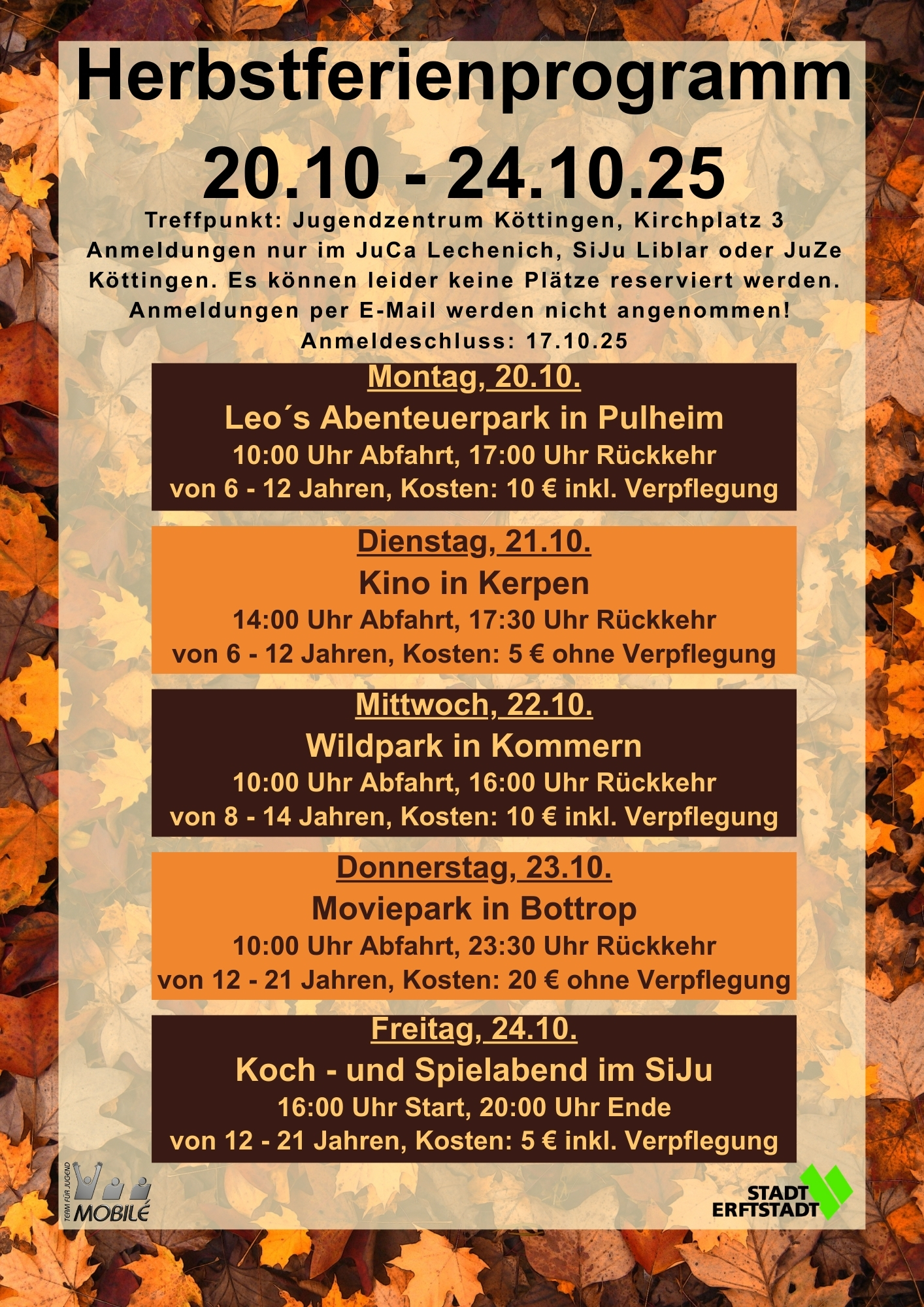 Die Jugendberatung Mobilé plant wieder tolle Ausflüge in den Herbstferien. Kinder und Jugendliche sind herzlich eingeladen, mit der Jugendberatung vom 20.10.2025 – 24.10.2025 tolle Aktivitäten zu erleben.