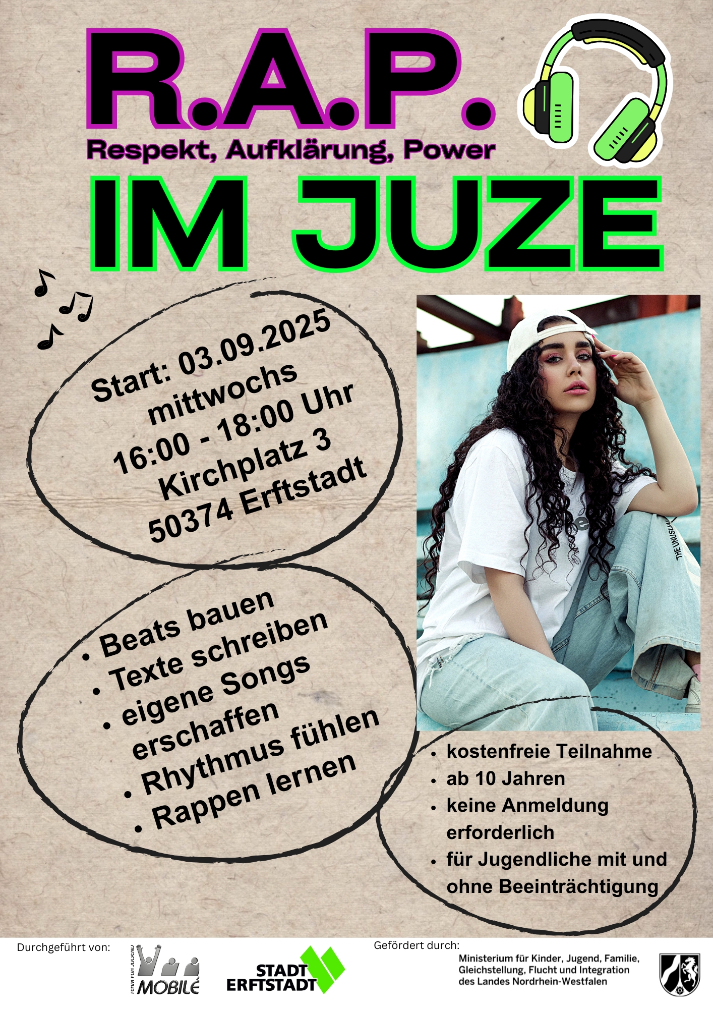 Ab dem 03. September 2025 veranstaltet das Jugendzentrum Köttingen jeden Mittwoch von 16:00 bis 18:00 Uhr ein Rap-Projekt für Jugendliche im Alter von 10 bis 18 Jahren. Die Teilnehmenden haben die Möglichkeit unter der fachkundigen Anleitung eines Musikreferenten ein Gespür für Hip-Hop, Rap und Pop zu entwickeln.