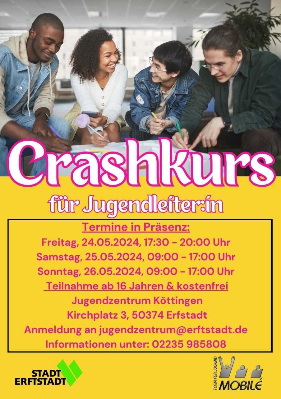 Vom 24. bis 26. Mai 2024 findet ein Crashkurs für Jugendleiter:innen im Jugendzentrum in Erftstadt Köttingen, Kirchplatz 3, statt. Die dreitägige Schulung eignet sich für interessierte Personen ab 16 Jahren, die sich in Vereinen, Verbänden oder in der offenen Kinder- und Jugendarbeit engagieren oder in den Ferien eine Freizeitmaßnahme betreuen möchten.