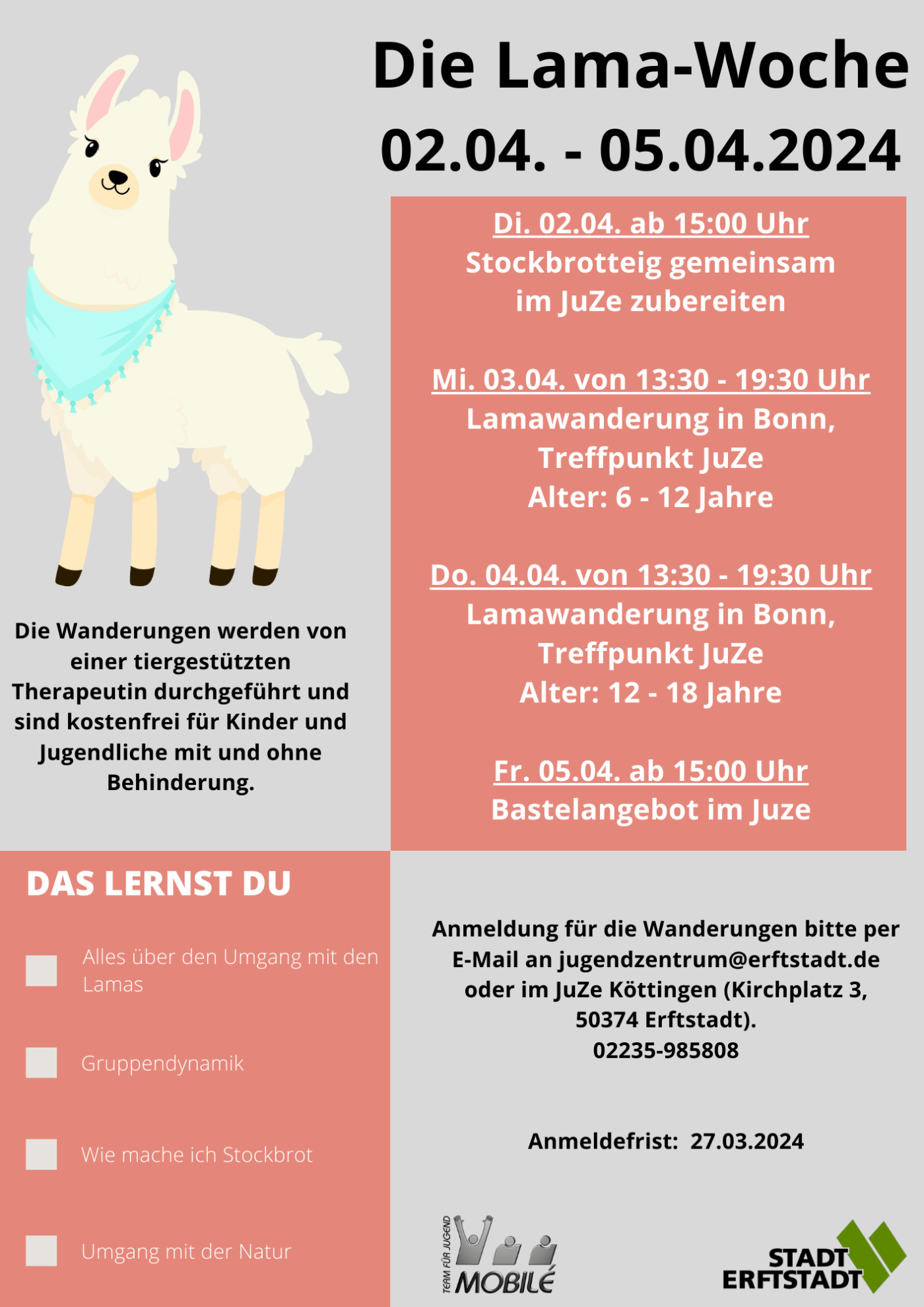 Der Anmeldeschluss ist der 21.05.2024. Die Anmeldeformulare sind im Jugendzentrum erhältlich oder auch im Internet unter www.jugendberatung-mobile.de abrufbar. Weitere Informationen gibt es unter Tel. 0 22 35 – 98 58 08 (Montag bis Freitag von 13:00 bis 18:00 Uhr) oder per E-Mail: jugendzentrum@erftstadt.de.