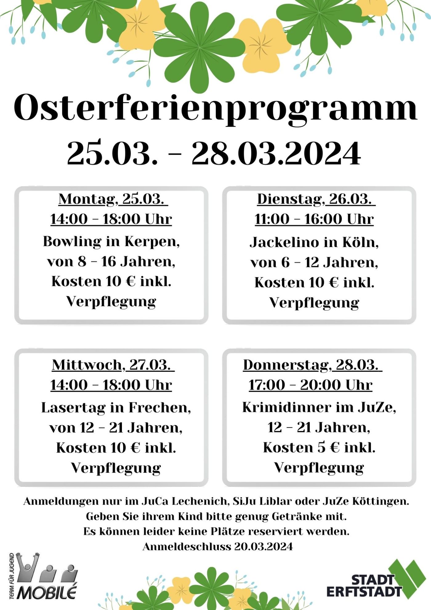 Für alle Veranstaltungen ist eine Anmeldung ab sofort bis zum 20. März 2024 möglich, entweder direkt im Jugendzentrum Köttingen (Kirchplatz 3), im Jugendtreff SiJu in Liblar (Bahnhofstr. 7) oder im Jugendcafé in Lechenich (Herriger Str. 20). Der Anmeldebogen kann auf der städtischen Homepage unter www.erftstadt.de/ferienprogramm abgerufen werden.