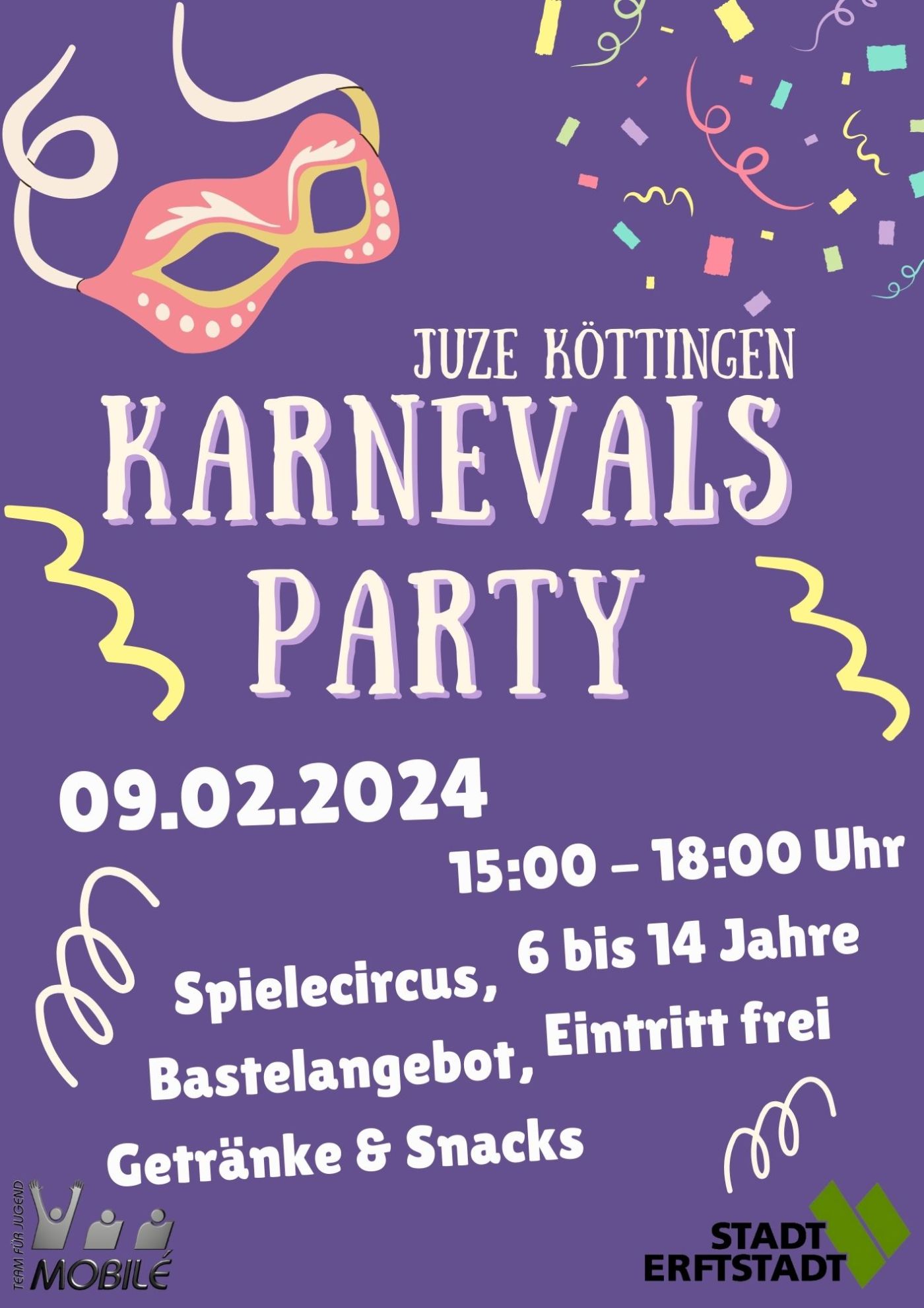 Das Jugendzentrum in Erftstadt-Köttingen, Kirchplatz 3, organisiert für Kinder von 6 bis 14 Jahren am Freitag, 09. Februar 2024, von 15:00 bis 18:00 Uhr eine große Kinder-Karnevalsparty.
