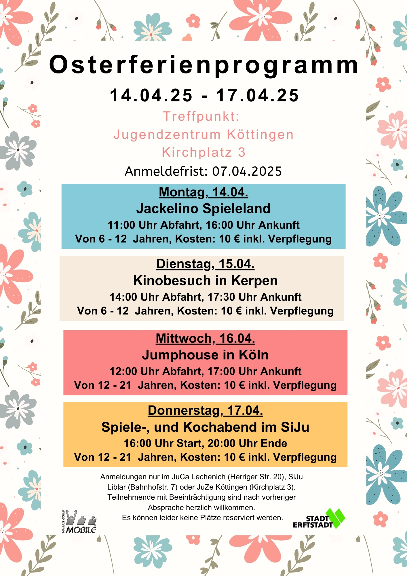 Bei Interesse, können sich Kinder und Jugendliche gerne persönlich anmelden. Anmeldebögen können im Jugendzentrum Köttingen (Kirchplatz 3), im Jugendtreff SiJu in Liblar (Bahnhofstr. 7) oder im Jugendcafé in Lechenich (Herriger Str. 20) ausgefüllt und abgegeben werden.