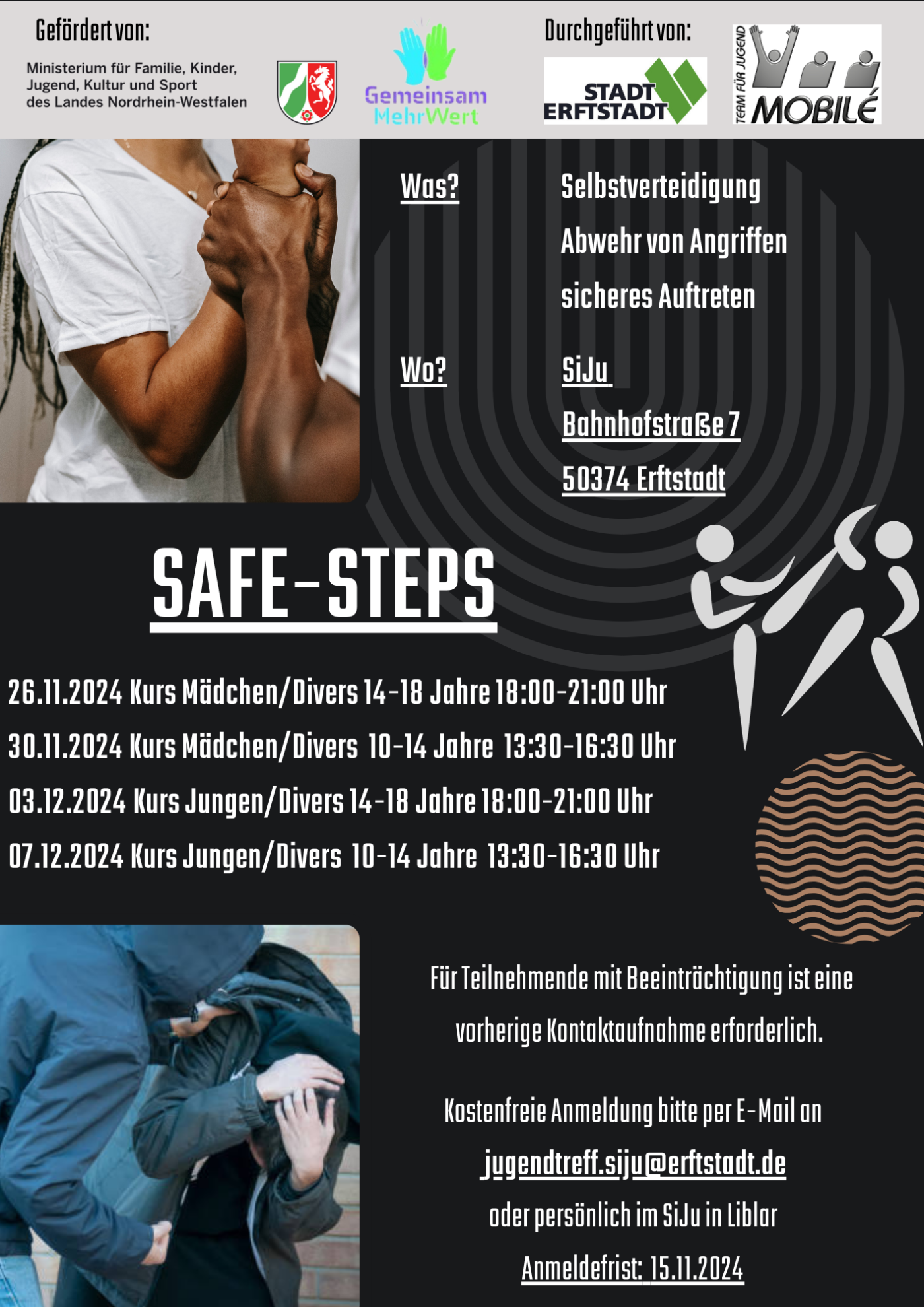 Für Rückfragen und Anmeldungen steht Ihnen das SiJu-Team unter jugendtreff.siju@erftstadt.de zur Verfügung.